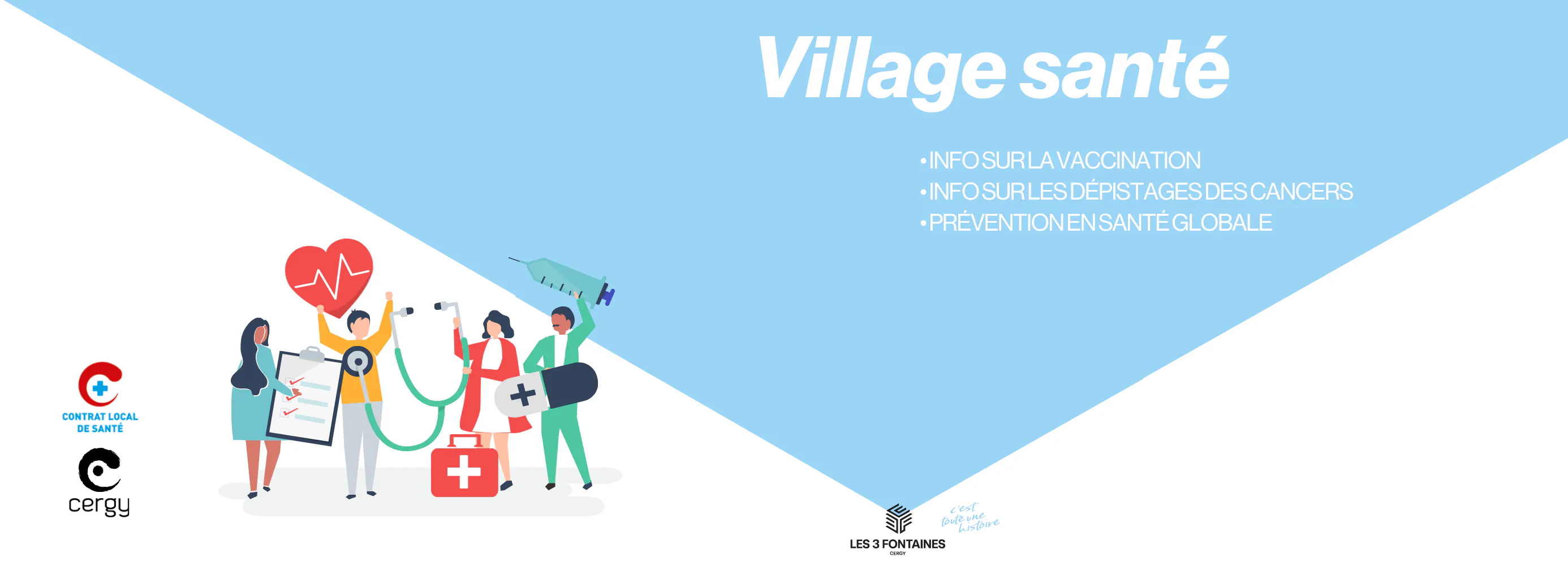 En partenariat avec l’ARS Île-de-France, les pharmacies du Centre gare, de l’Étoile, du Parvis, votre centre commercial Les 3 Fontaines organise un village Santé pour vous proposer gratuitement un village d’information sur différentes thématiques avec plusieurs structures santé du territoire.
